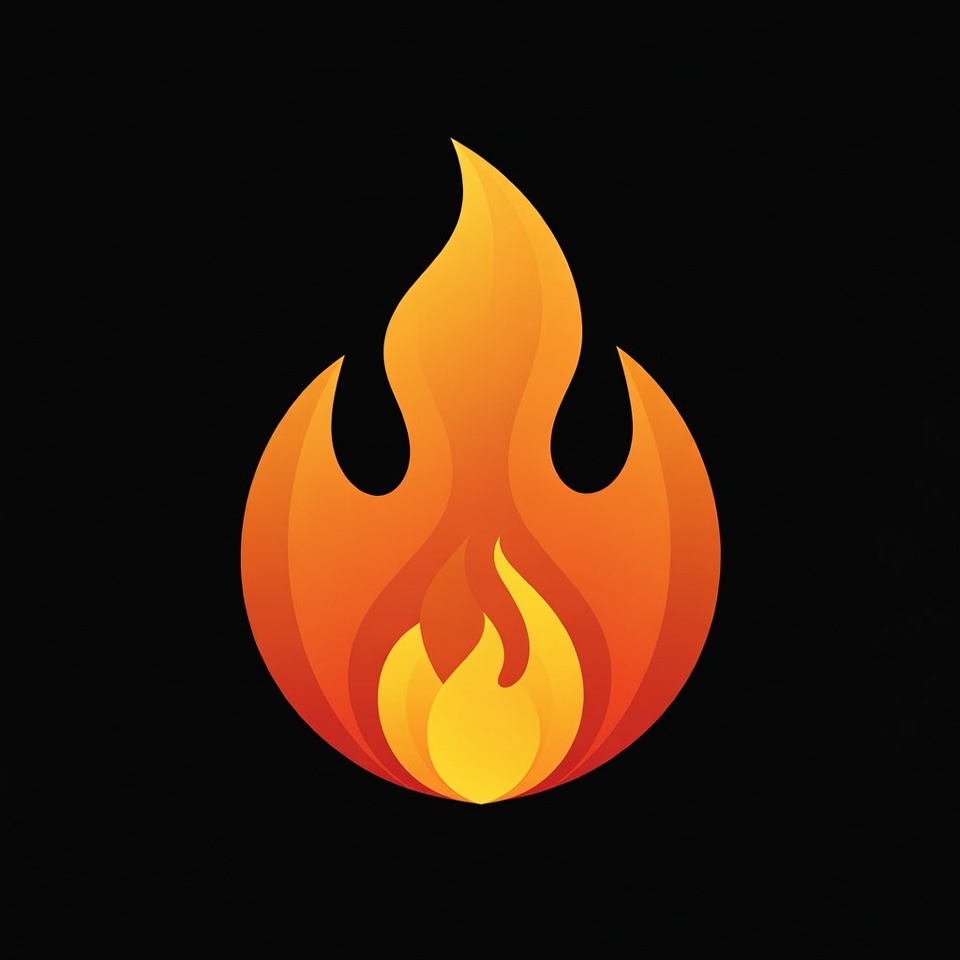 A vibrant orange flame illustration features multiple curved fiery layers in yellow and orange hues. It is centered against a solid black background with smooth gradient shading. The design has a symmetrical, stylized appearance typical of vector graphics.