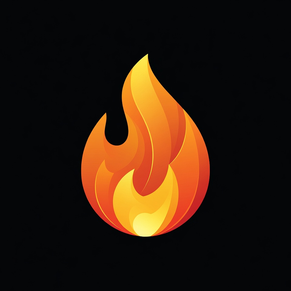 A vibrant orange flame illustration features smooth gradients and dynamic curves. It stands isolated against a solid black background. The design has a modern, stylized appearance with glowing yellow highlights at the core.
