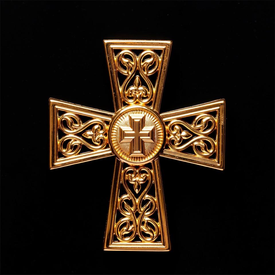 Christian symbol, black background, craftsmanship, cross, crucifix, detailed engraving, filigree, fleur-de-lis, gold, intricate design, isolated, jewelry, medallion, metallic, ornate, religious, religious icon, sacred, shiny, vintage style, golden cross