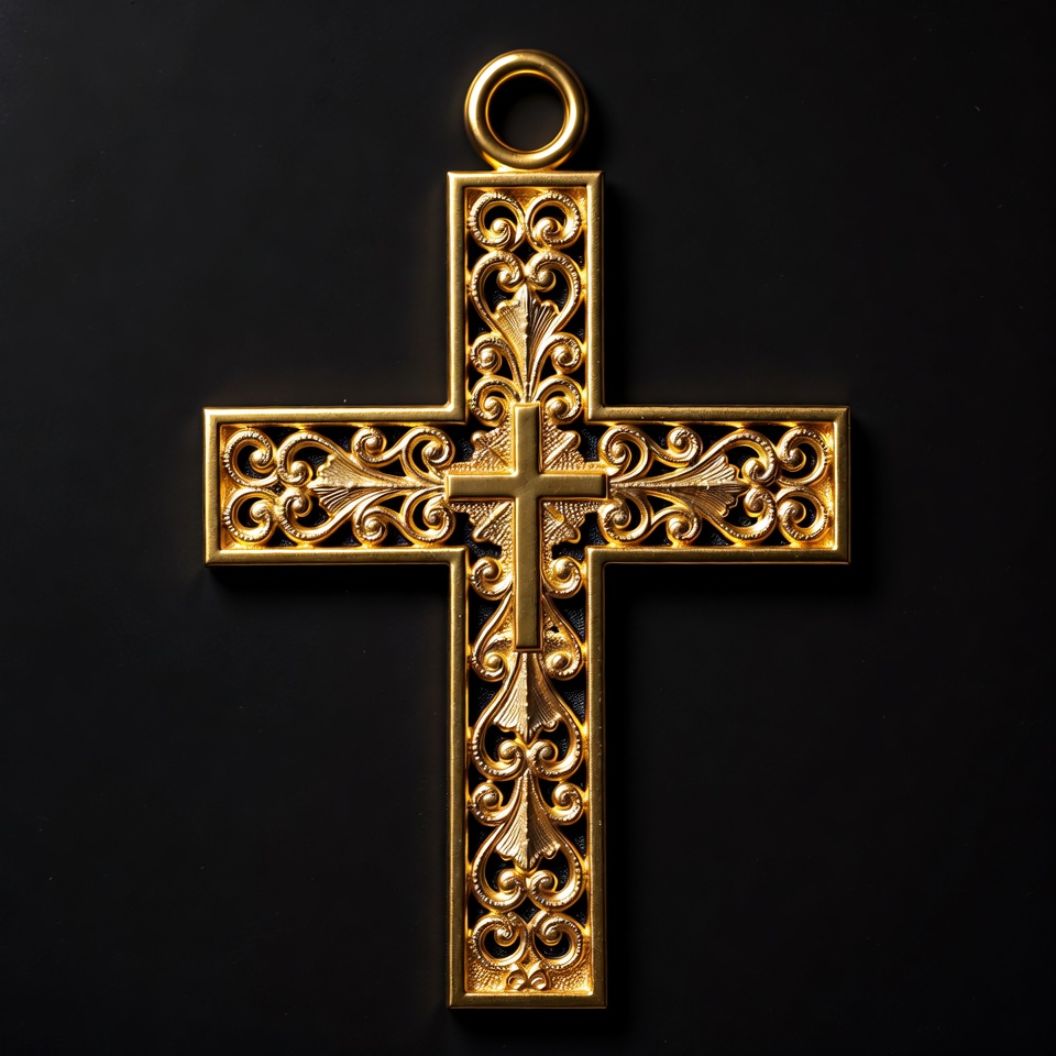 black background, christian cross, cross pendant, crucifix, faith symbol, filigree cross, gold jewelry, intricate design, jewelry, metallic gold, necklace pendant, ornate cross, religious symbol, scrollwork, gold cross