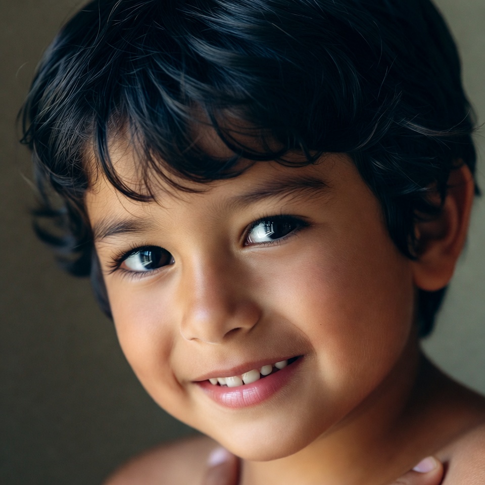 A young Asian boy with curly black hair smiles warmly at the camera in a close-up portrait. His large expressive eyes and rosy cheeks are highlighted against a neutral background. He shows his teeth in a joyful grin.