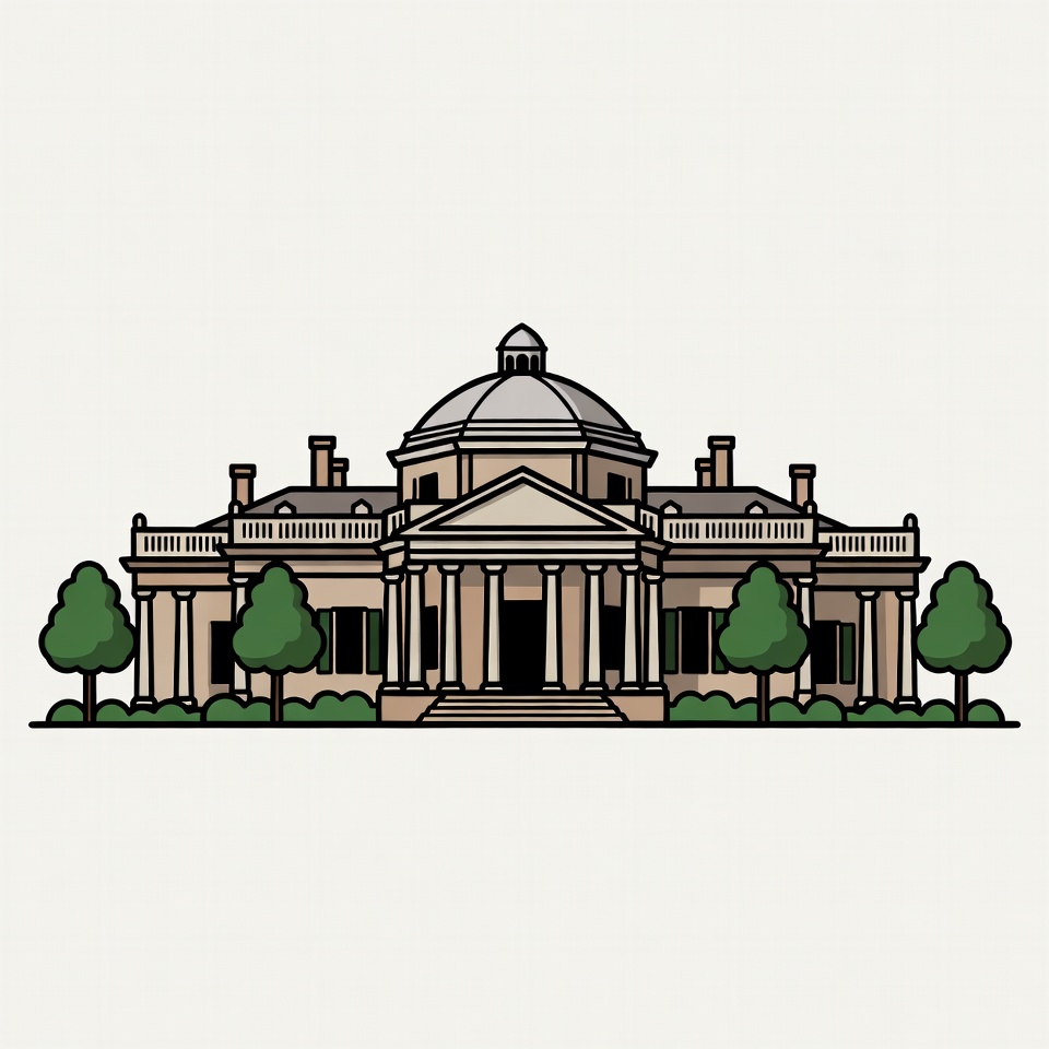 A line art illustration depicts a grand neoclassical mansion with a prominent central dome and columned portico. Flanking trees frame the symmetrical building, which features multiple chimneys and arched windows. The isolated white background highlights the architectural details.