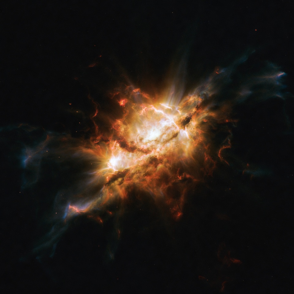 Hubble image, astronomical image, astronomy, astrophysics, black background, blue hues, celestial, cosmic dust, cosmic nebula, deep space, emission nebula, galaxy, gas clouds, glowing clouds, interstellar, orange nebula, red filaments, space, space phenomenon, stars, stellar nursery, universe, yellow glow, nebula