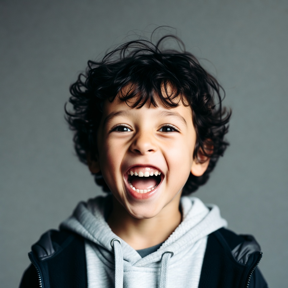A young boy with curly black hair smiles widely, showing his teeth in a joyful laugh. He wears a gray hoodie with black accents and stands against a plain gray background. His expressive face features bright eyes and prominent dimples.