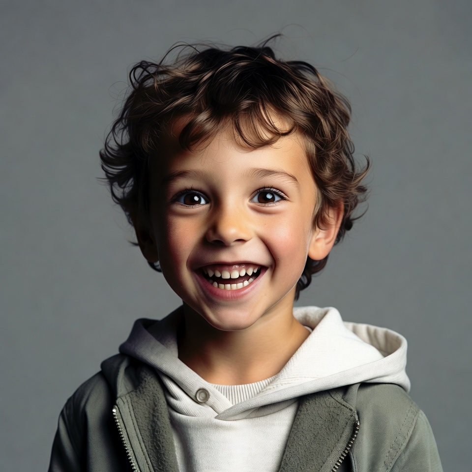A young boy with curly brown hair smiles happily at the camera against a gray background. He wears a white hoodie under a green zip-up jacket. His wide eyes and bright smile convey joy.
