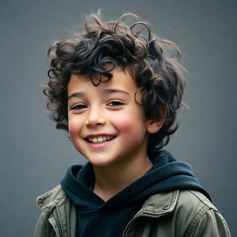 A young boy with curly brown hair smiles brightly at the camera against a gray background. He wears a black hoodie under a green jacket. His eyes are expressive and his cheeks are slightly flushed.