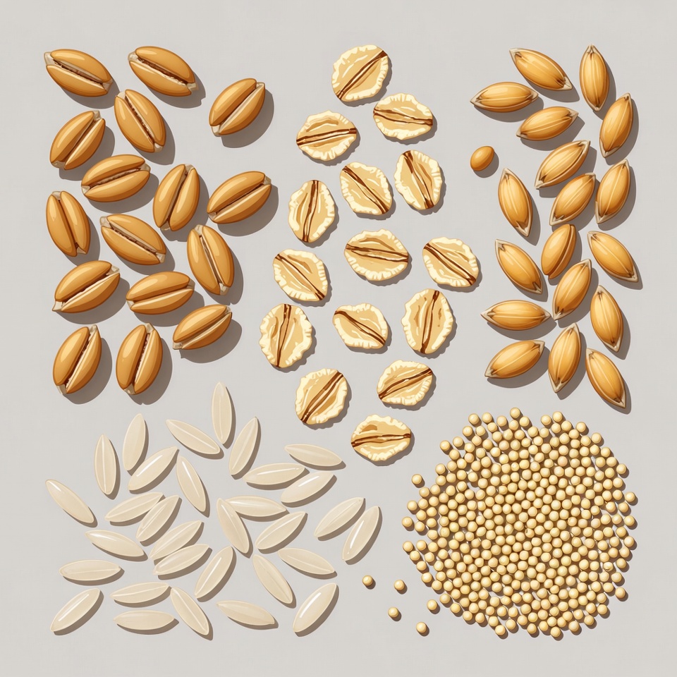 Various grains and seeds are arranged on a light gray background. Golden wheat grains, split oats, white rice grains, and small yellow seeds are scattered in groups. The collection showcases different textures and shapes of these natural food items.