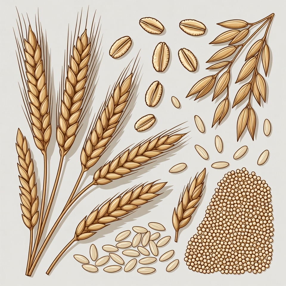 agriculture, barley-like, cereal plant, clipart, farming, food crop, golden wheat, grains, harvest, illustration, isolated background, kernels, nature, organic, pile of grains, plant, stalk, vector art, wheat grains, wheat stalks, wheat