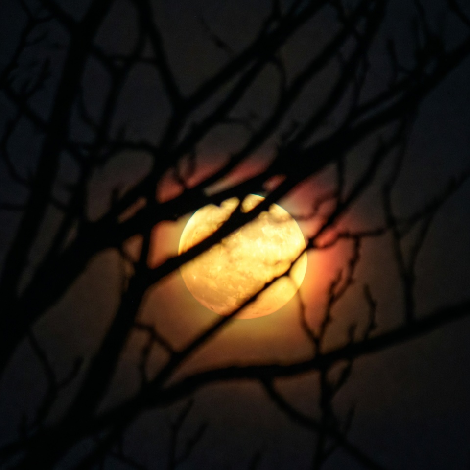 astronomy, bare branches, branches, dark sky, full moon night, golden moon, lunar, moon, moonlit branches, nature, night sky, nocturnal, silhouette, sky, tree branches, trees, full moon