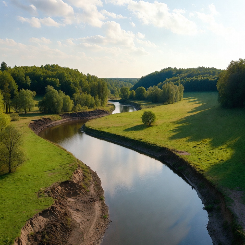 aerial view, bend, blue sky, clouds, drone photo, environment, flow, foliage, forest, grass, green meadows, hillside, landscape, lush greenery, nature, outdoors, panorama, peaceful, riverbank, scenic, shadows, sunlight, trees, valley, verdant, waterway, winding river, river