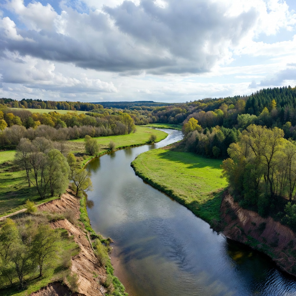 aerial view, autumn, autumn landscape, cloudy sky, drone photo, eroded banks, fall colors, foliage, forest, green grass, landscape, meadows, nature, orange leaves, outdoors, river bend, scenery, trees, valley, vibrant colors, waterway, winding river, woods, yellow trees, river