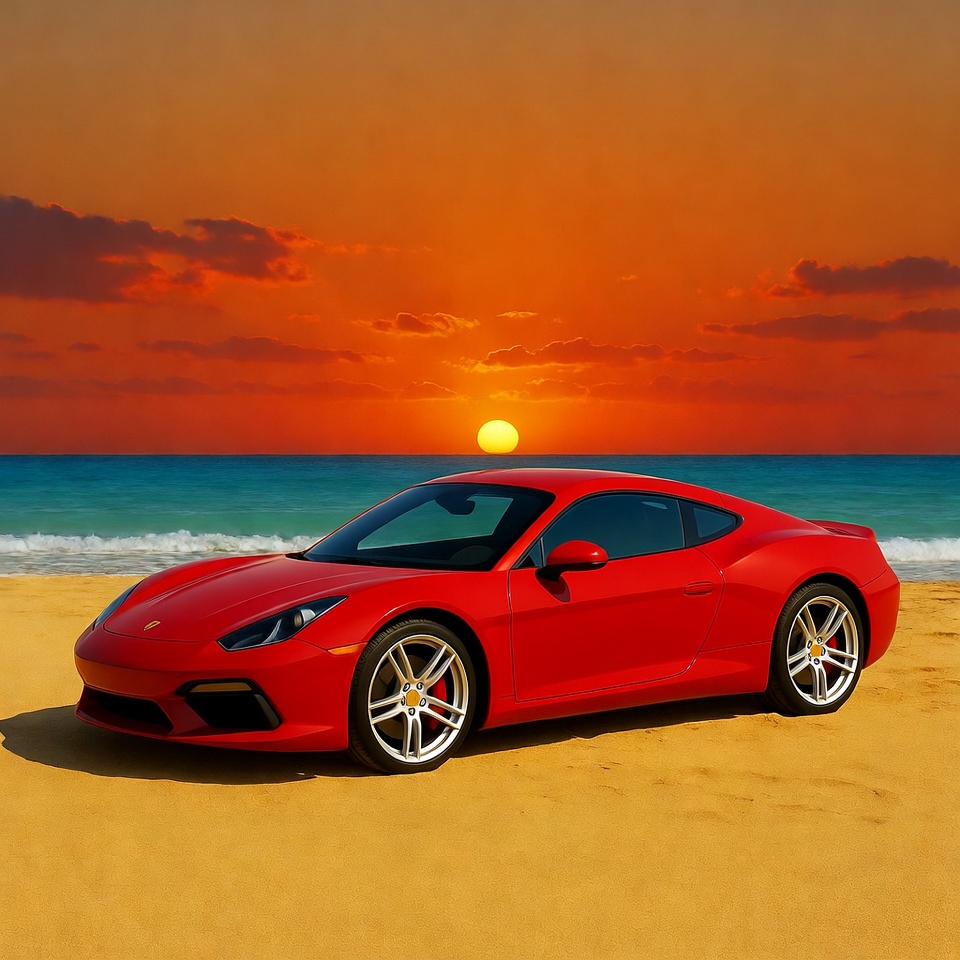 A sleek red Ferrari sports car is parked on a sandy beach with ocean waves in the background. The vibrant orange sunset sky reflects on the car's glossy surface and the calm sea. The car features distinctive Ferrari styling, including large alloy wheels and a low coupe profile.