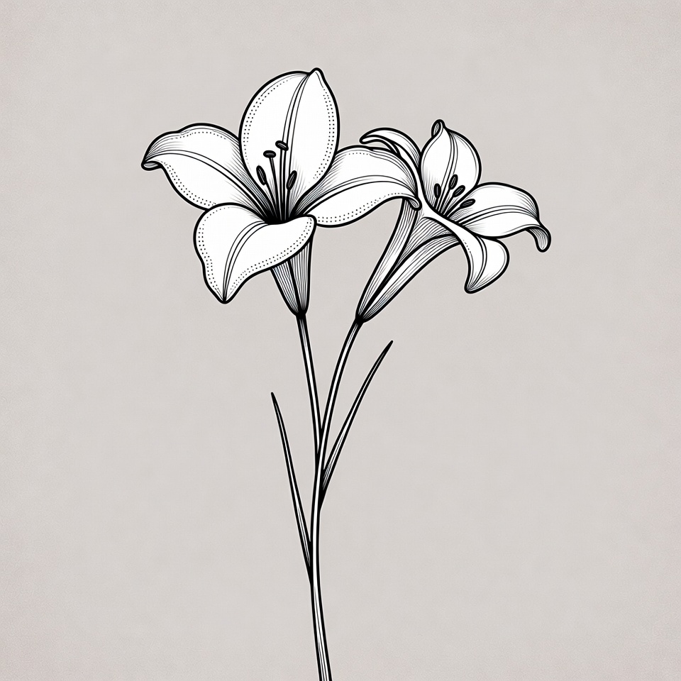 botanical art, clipart, floral illustration, flower drawing, illustration, ink drawing, isolated background, lily flowers, line art, petals, simple flowers, stems, two lilies, white flowers, white lilies, lilies