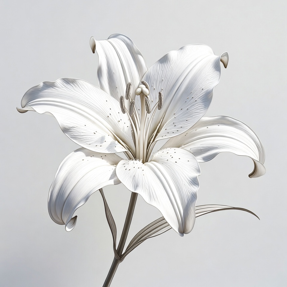 A detailed white lily flower with gracefully curved petals and prominent stamens stands against a plain white background. The flower features a slender metallic-toned stem and subtle shading for depth. Its petals have fine veins and soft edges, creating a realistic illustration effect.