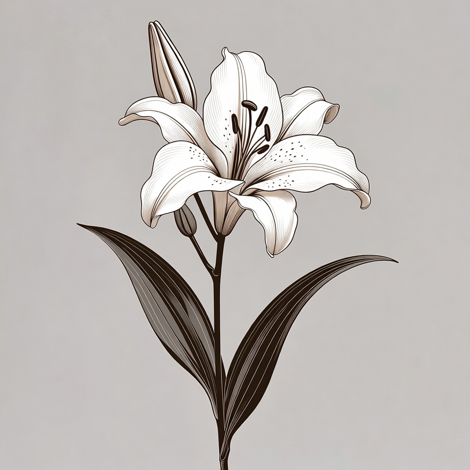 botanical art, clipart, floral illustration, flower drawing, flower stem, green leaves, illustration, isolated background, lily illustration, lily petals, lily stamens, line art, vector flower, white lily, lily flower