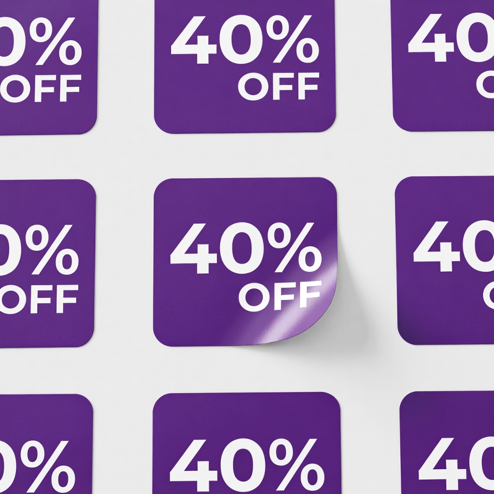 Multiple purple discount stickers displaying '40% OFF' are arranged on a white background. The stickers have white text with bold percentages and 'OFF' labels. They feature a glossy, curled-edge design typical of promotional labels.