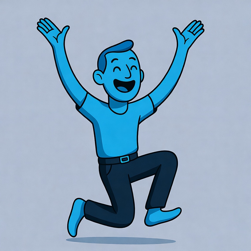 A cartoon blue man kneels with one leg raised, joyfully lifting both arms high. He wears a short-sleeved t-shirt, belt, and pants, smiling widely with squinted eyes. The illustration features a simple isolated light blue background.