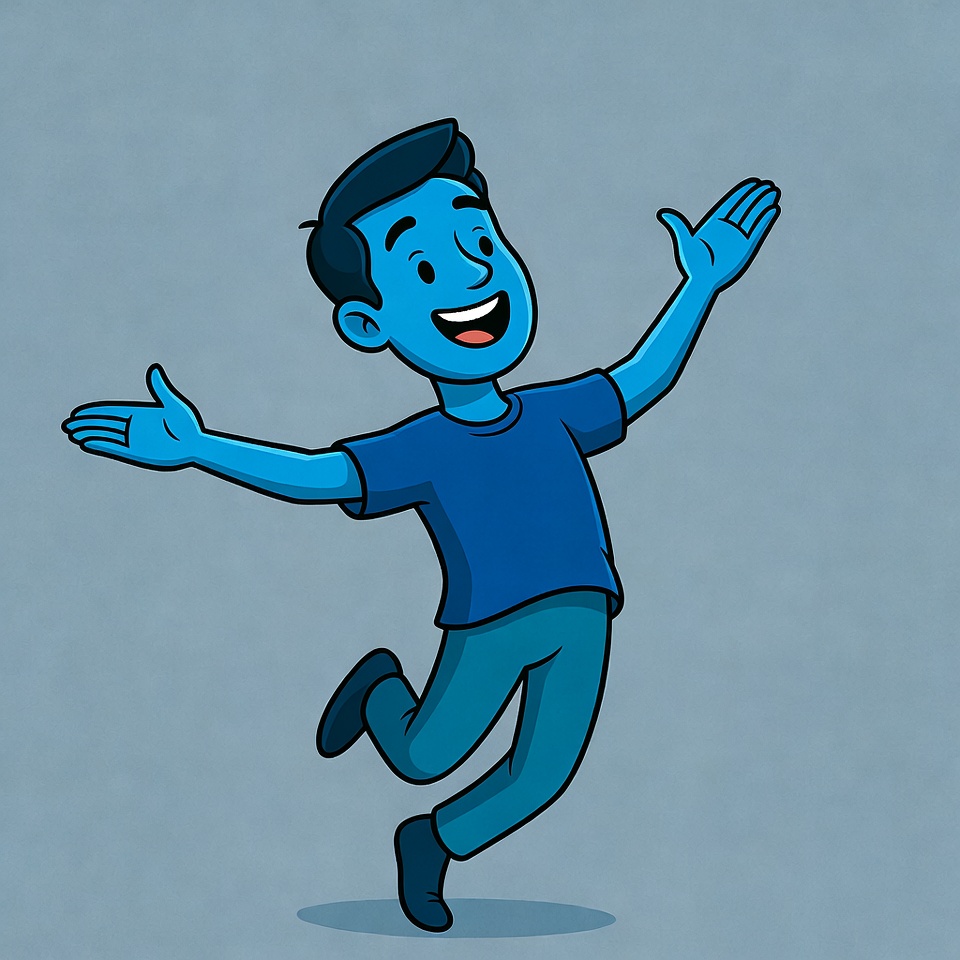 A blue cartoon man with short dark hair smiles widely while jumping with arms spread wide open. He wears a blue t-shirt, blue pants, and dark shoes. The illustration features him on a plain light blue background.