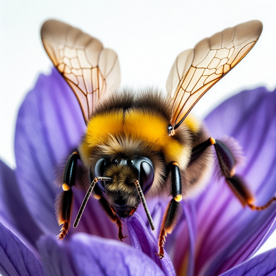 A close-up of a bumblebee with yellow and black fuzzy body landing on a vibrant purple flower. Its wings are spread wide, and legs grip the petal edges. The bee's large black eyes and antennae are prominently visible against the white background.