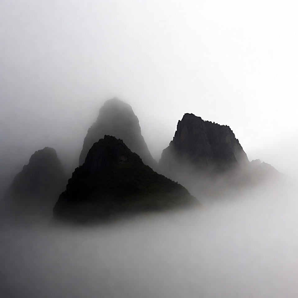 clouds, dark mountains, dramatic fog, fog, foggy landscape, foggy peaks, grey fog, landscape, mist, misty mountains, mountain range, nature, rocky peaks, silhouettes, mountains