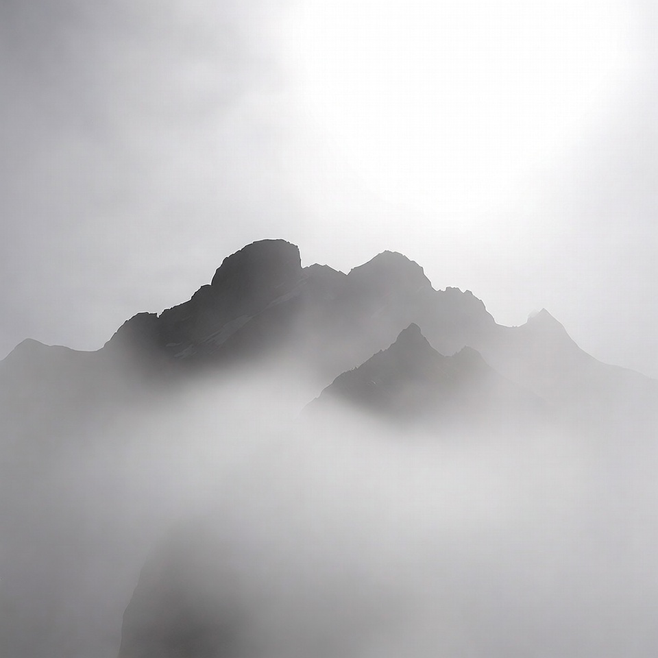 Silhouetted rocky mountain peaks rise dramatically against a cloudy sky. Thick layers of fog and mist envelop the rugged summits and lower slopes. The scene features a monochromatic, ethereal atmosphere with soft gradients of gray.