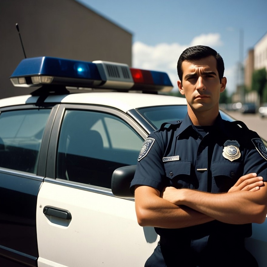 A male police officer with short dark hair stands with arms crossed, leaning against a white police car with red and blue lights on top. He wears a dark blue uniform shirt with badges and name tag, positioned in front of a brick building on a sunny urban street. The car door is open, and city buildings are visible in the background.