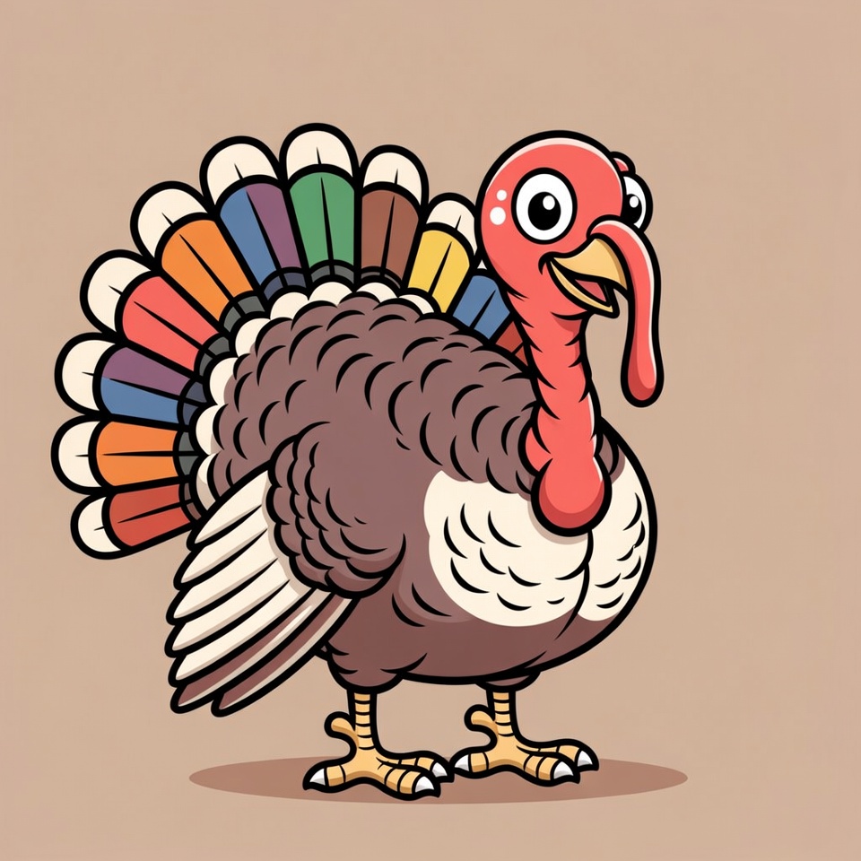 animated bird, big eyes, bird, brown feathers, cartoon turkey, clipart, colorful feathers, cute turkey, farm animal, festive turkey, illustration, isolated background, rainbow tail, red head, smiling beak, thanksgiving turkey, turkey illustration, vector art, yellow feet, turkey