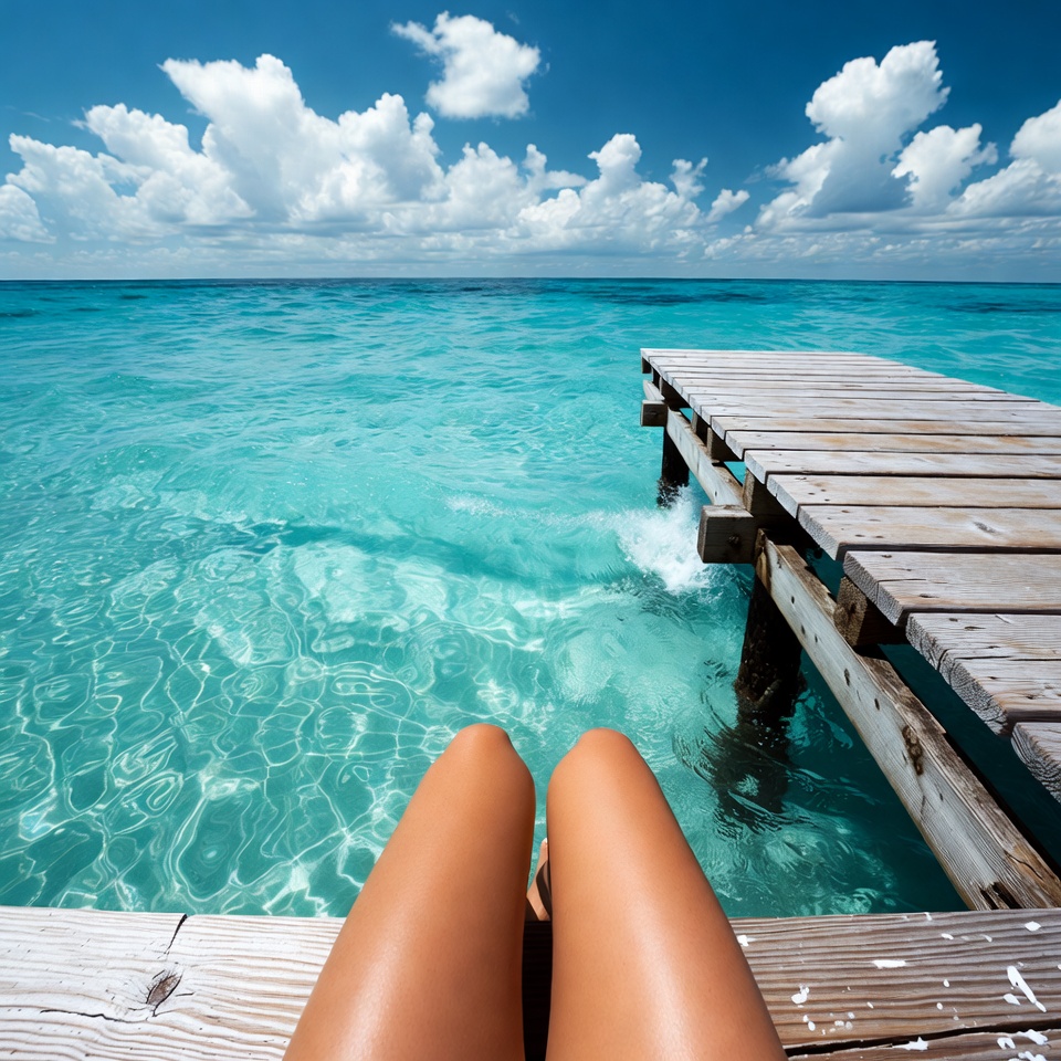 bare feet, beach, blue sky, clear water, dock, feet, horizon, idyllic, legs, ocean, paradise, pier, resort, sea, summer, sunny, tanned legs, travel, tropical, turquoise water, vacation, waterfront, waves, white clouds, wooden pier, woman
