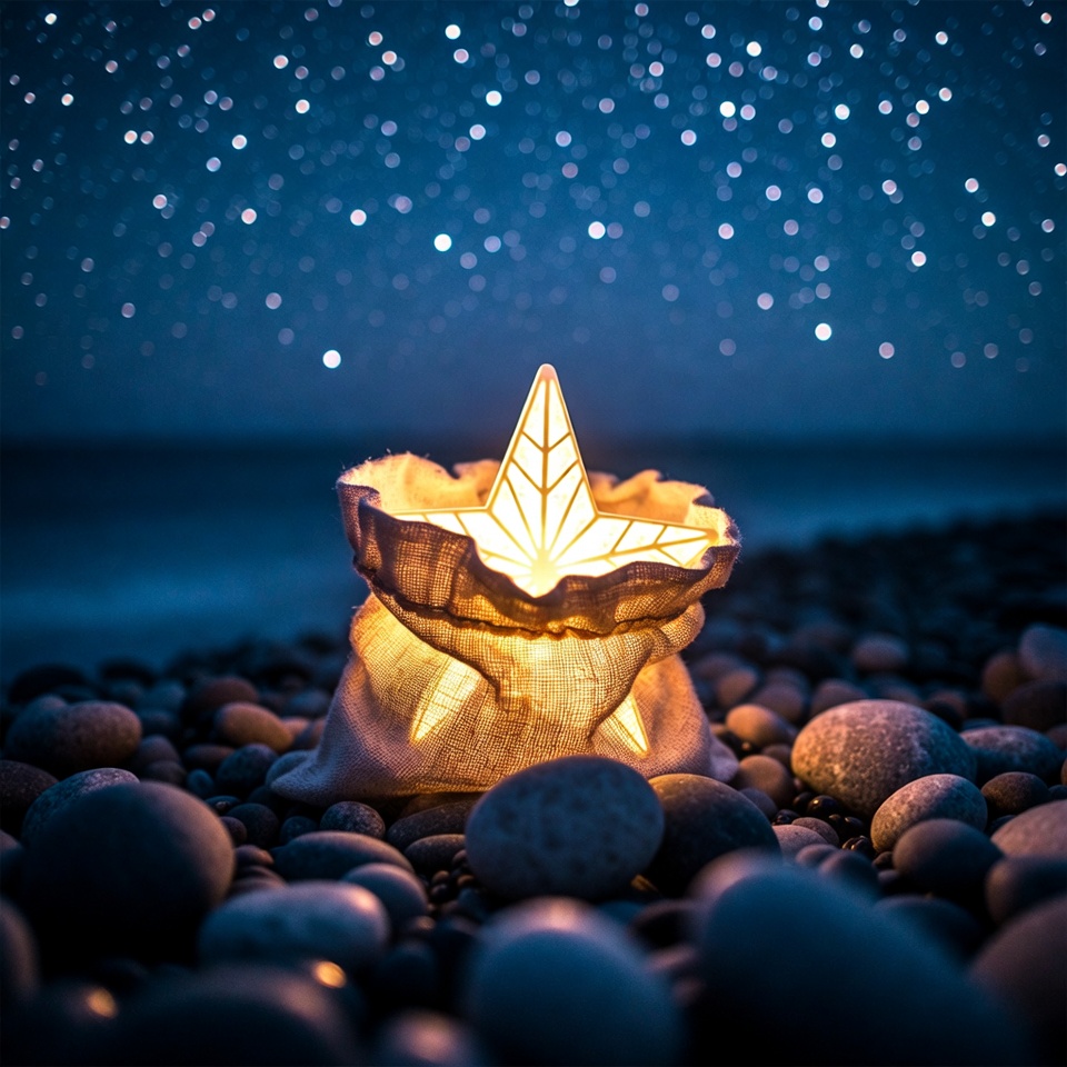 beach stones, bokeh, burlap sack, dark pebbles, fabric sack, glowing star, golden light, illumination, isolated background, lantern, magical light, night sky, outdoor scene, pebbles, rocks, star lantern, starry background, stars, textured sack, star light