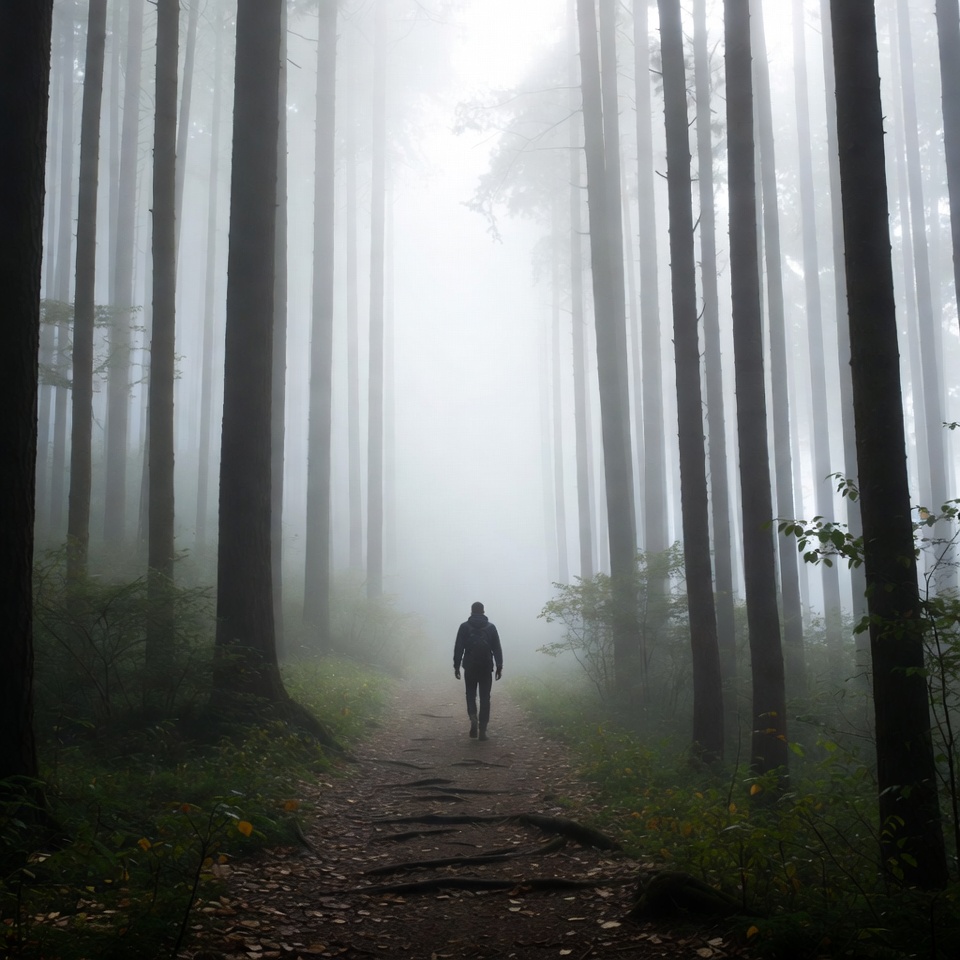 A man in a dark hooded jacket walks down a narrow dirt path through tall pine trees enveloped in thick fog. The forest floor is covered with green moss and small plants, and the dense mist obscures the background. Sunlight filters faintly through the canopy, creating an ethereal atmosphere.
