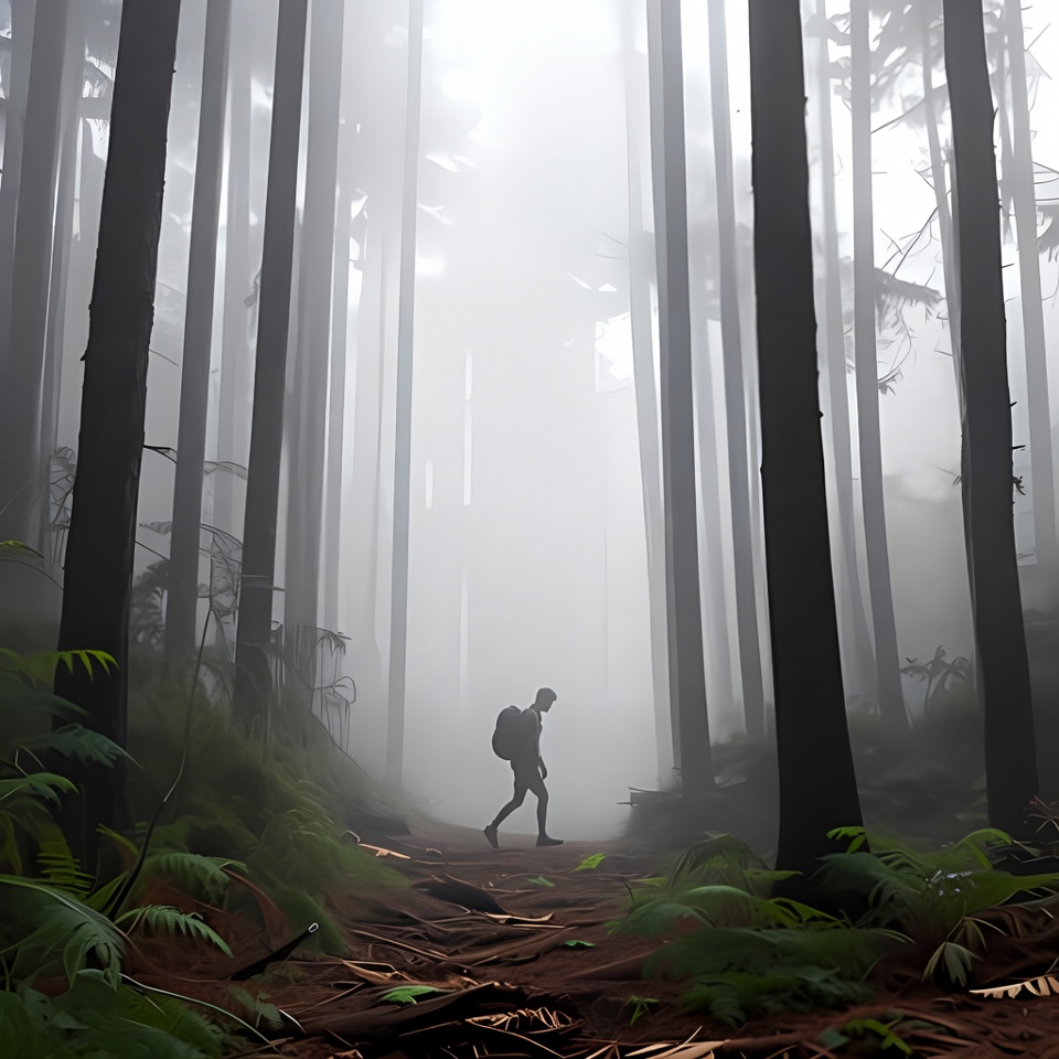 A lone hiker with a backpack walks along a narrow dirt path through tall trees shrouded in thick fog. The scene features dense ferns and mossy ground under a canopy of misty conifers. Sunlight filters softly through the mist, creating a dramatic silhouette of the hiker.