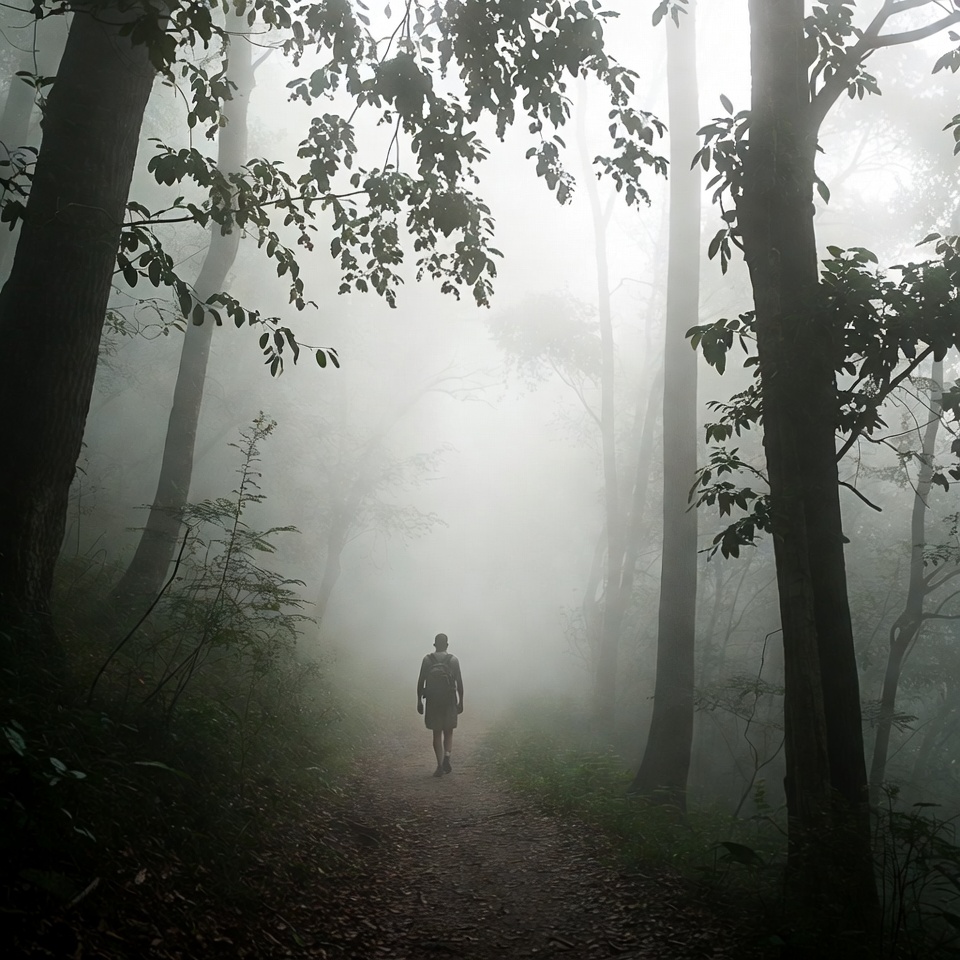 A man walks down a narrow dirt path through a dense forest enveloped in thick fog. Tall trees with lush green leaves line both sides of the trail, and he wears a backpack while dressed in casual hiking clothes. The misty atmosphere obscures the background, emphasizing the solitude of the scene.