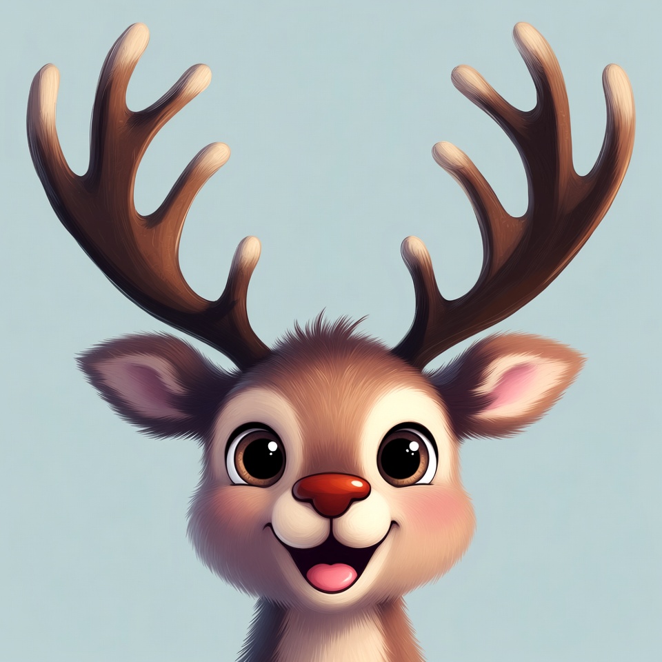 A cute cartoon reindeer with large antlers faces forward on a light blue background. It has big sparkling eyes, a shiny red nose, and a wide happy smile showing its teeth. The fluffy fur and soft shading give it an adorable, illustrated style.