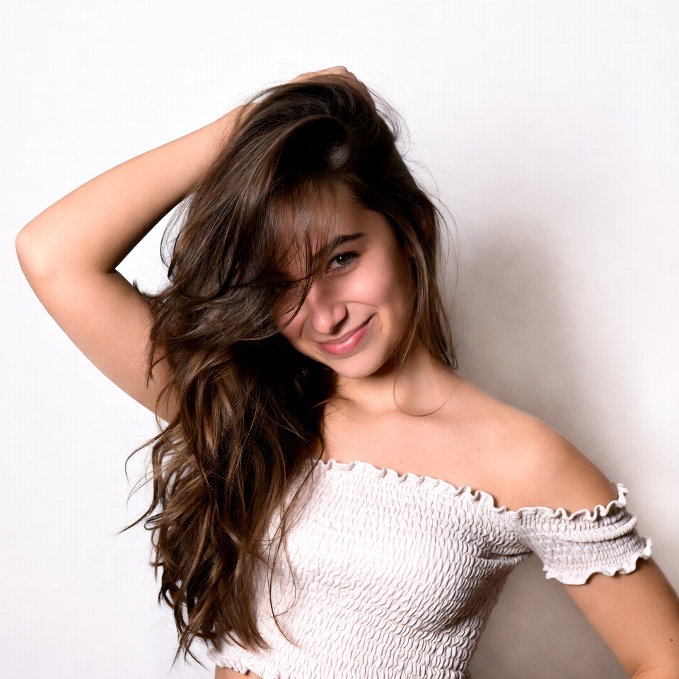 A young woman with long wavy brown hair smiles playfully while tilting her head and touching her hair with her hand. She wears an off-shoulder white ruffled top that exposes her shoulders. She poses against a plain white background.