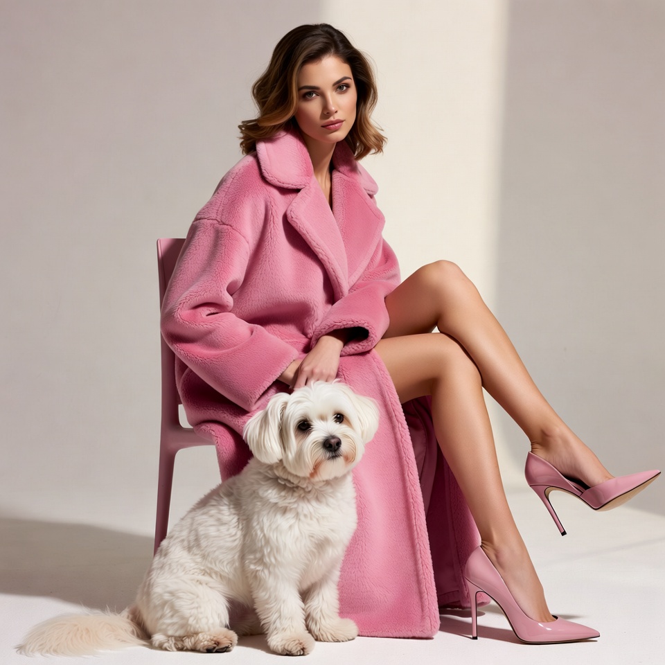 A young woman with wavy brown hair sits on a chair wearing a long pink fur coat and high heels. She holds a small white fluffy dog on her lap. The image features a plain white background with soft lighting.