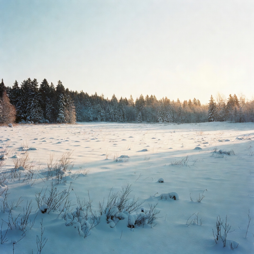 Snowy Field with Pine Trees at Sunset