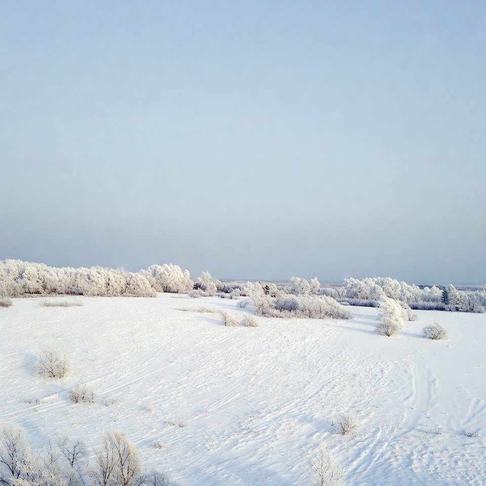 A vast snowy field stretches under a pale blue sky with bushes covered in white frost along the edges. The snow-covered landscape features gentle tracks in the snow and clusters of trees in the distance. The scene captures a serene winter vista from an elevated perspective.