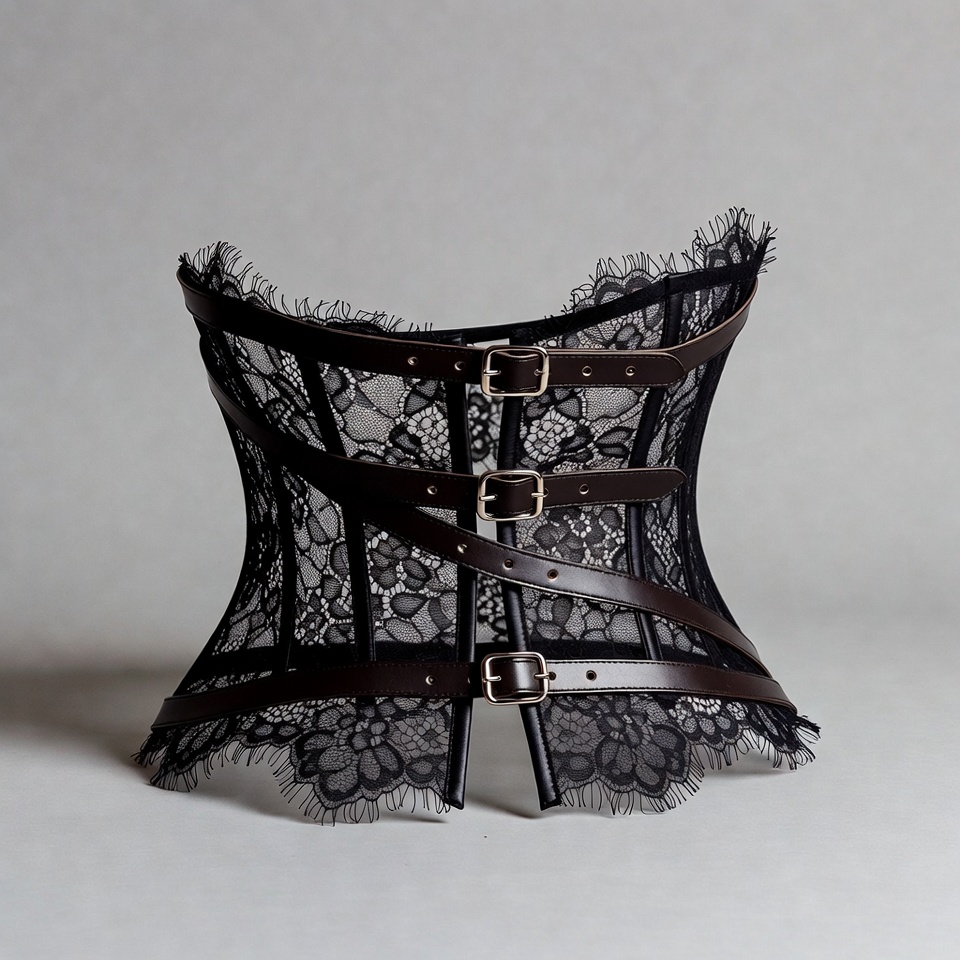 black corset, black lace, brown leather, buckles, fashion, floral lace, isolated background, lace corset, leather straps, lingerie, sexy lingerie, silver buckles, straps, undergarment, waist cincher, corset
