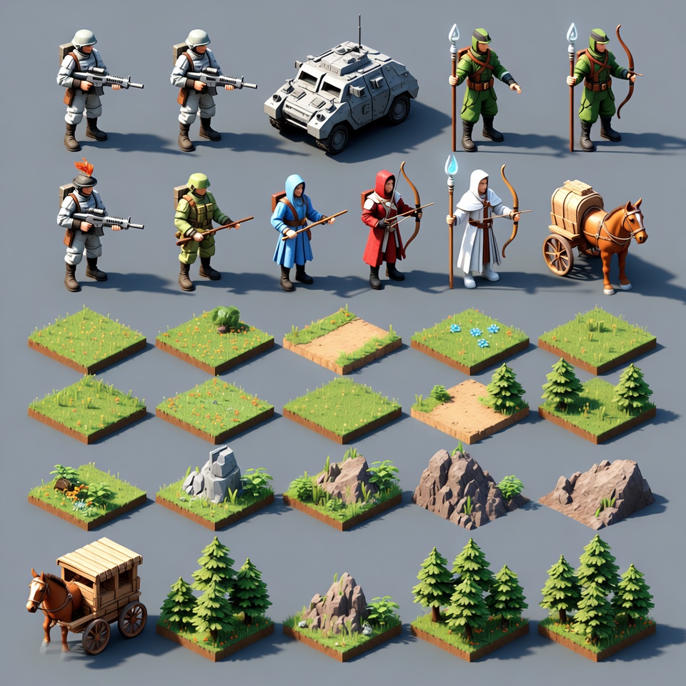 3D models, APC vehicle, bows, bushes, dirt path, fantasy characters, grass tiles, horses, isolated background, isometric tiles, low poly, men, military uniform, rifles, rocks, soldiers, spears, stone, trees, wagons, women, game assets