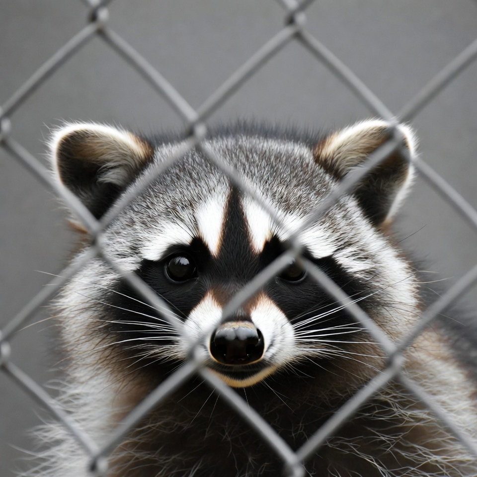 Raccoon peering through chain link fence