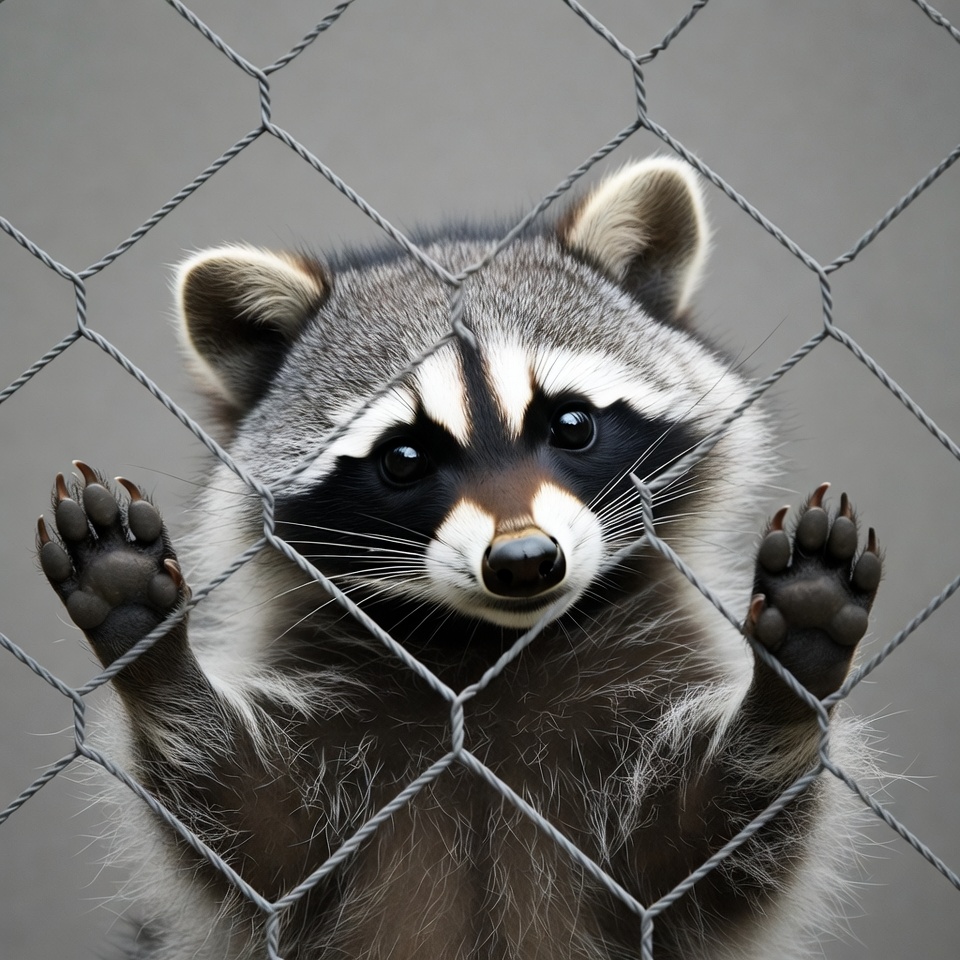 animal, big eyes, black mask, chain link fence, closeup, cute raccoon, furry animal, gray fur, isolated background, masked face, paws, peeking, raccoon fence, striped tail, wildlife, wire fence, raccoon