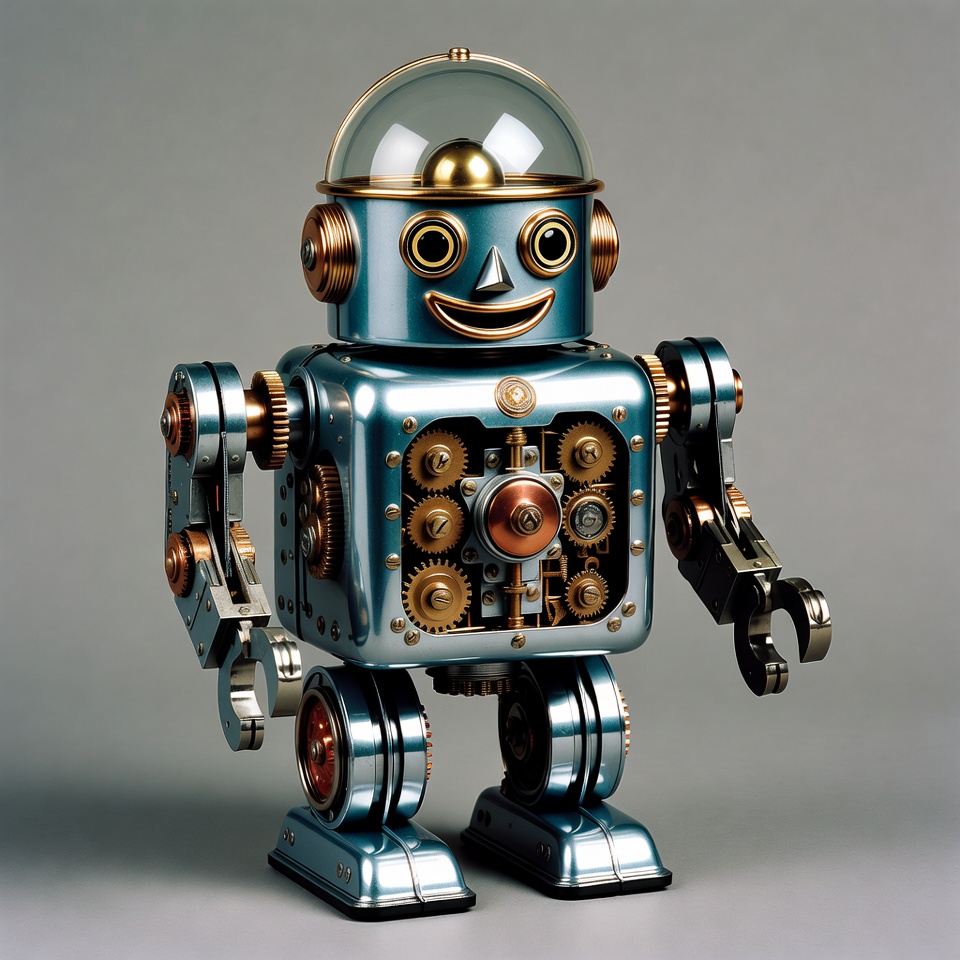 blue robot, brass, cogwheels, dome head, futuristic, gears, isolated background, machinery, mechanical, metallic, retro, smiling robot, steampunk, steampunk toy, toy robot, vintage robot, robot