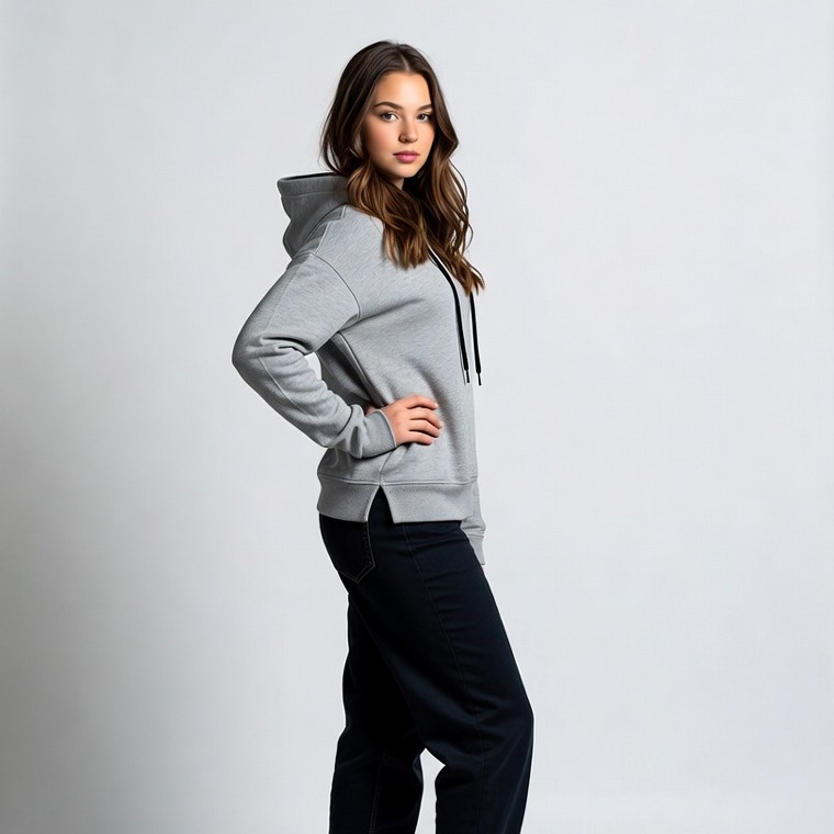 A young woman with long wavy brown hair stands confidently with hands on hips against a plain white background. She wears a gray hoodie with hood and drawstrings paired with matching gray pants. Her pose is side profile, showcasing the casual streetwear outfit.