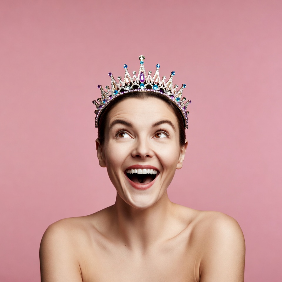 A young White woman with dark hair wears a sparkling multicolored jeweled crown on her head. She smiles widely with an open mouth and wide eyes, looking upwards. Her shoulders are bare against a solid pink background.