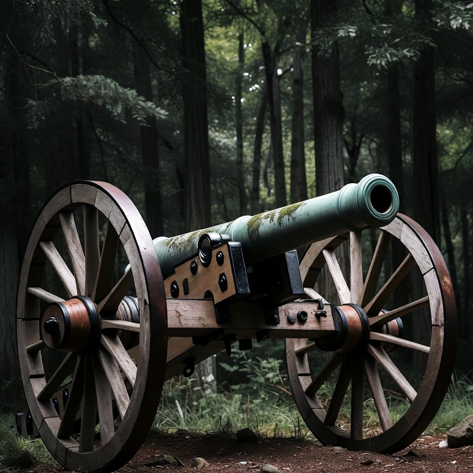 abandoned cannon, antique artillery, artillery, battlefield relic, dense trees, foggy woods, foliage, forest, green barrel, historical cannon, military relic, misty forest, moss, nature, old cannon, outdoor, overgrown cannon, rustic cannon, trees, vintage weapon, wilderness, wooden wheels, woodland scene, woods, cannon
