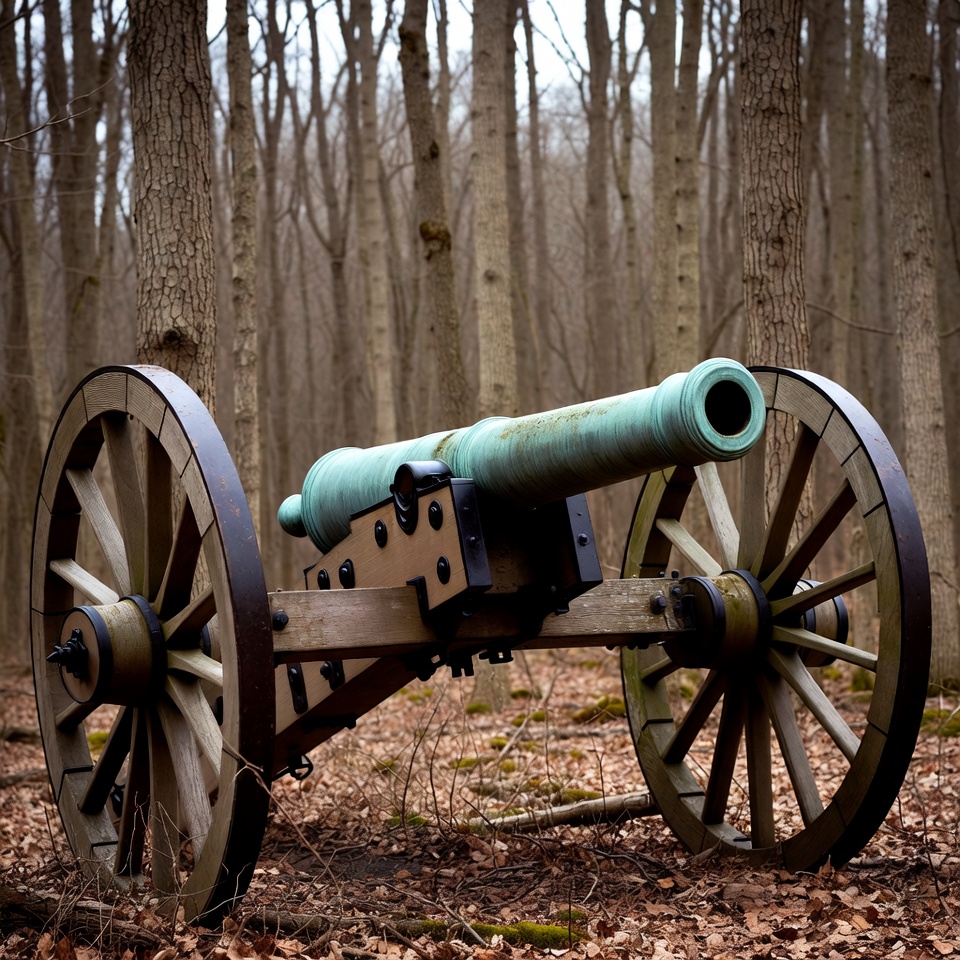 antique cannon, artillery, autumn forest, bare trees, battlefield cannon, civil war cannon, forest, green barrel, gun carriage, historical cannon, isolated background, military history, old cannon, rusted metal, trees, wooden wheels, woods, cannon