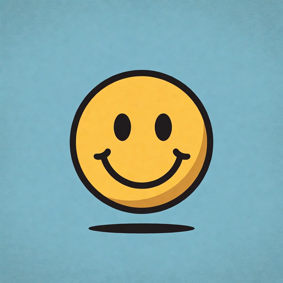 A bright yellow smiley face with black eyes and a wide curved mouth smiles on a light blue background. The illustration features a simple black outline and a subtle shadow beneath it. It has a cheerful, cartoonish design.