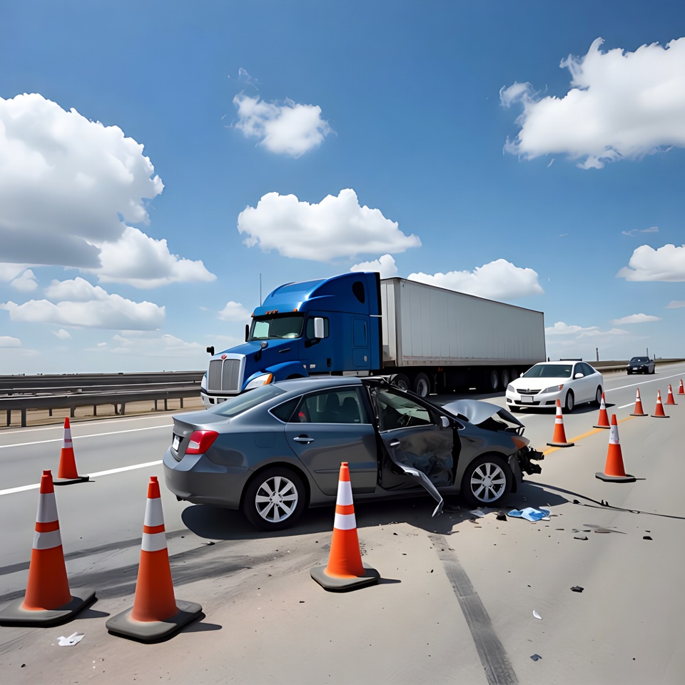 blue truck, clear sky, clouds, damaged car, gray sedan, highway, highway collision, orange cones, rear-end collision, road debris, semi truck, traffic cones, truck accident, white cars, wreckage, car crash
