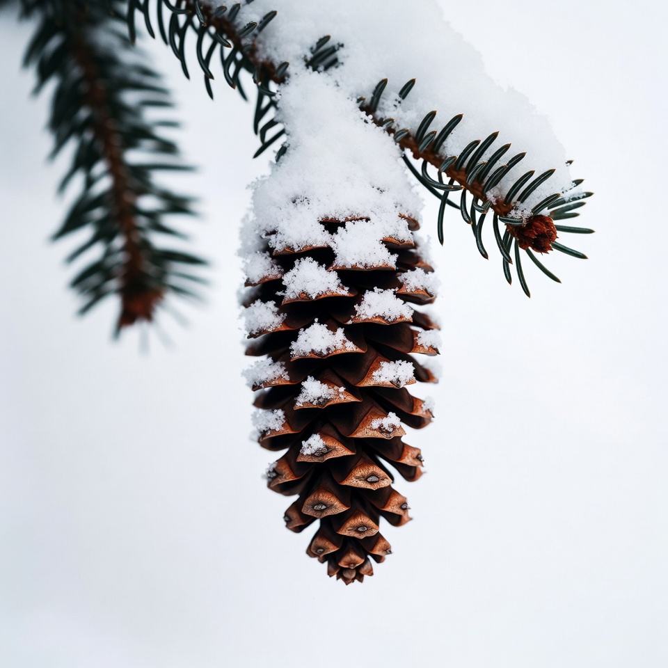 Christmas, closeup, cold, conifer, evergreen, fir branch, forest, frost, green needles, hanging cone, macro, nature, needles, pine tree, scales, snow, snowy cone, tree branch, white snow, winter, pine cone