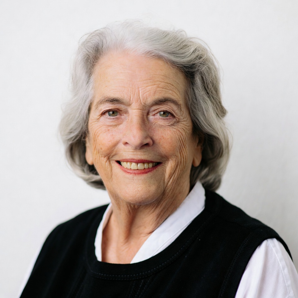 An elderly woman with silver wavy hair smiles warmly at the camera. She wears a black vest over a white collared shirt. The portrait is set against a plain white background.